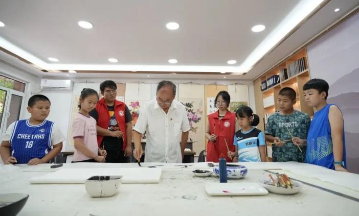 7月19日,书法爱好者在河北省唐山市丰南区新华社区开办的“爱心暑托班”上为孩子们讲解书法知识。