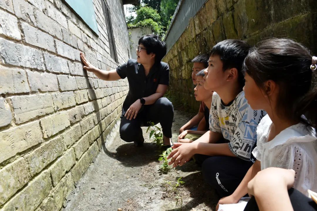 ▲孩子们在志愿者引领下查看留存的古代建筑题刻。认识家乡曾经也是藏龙卧虎之地,增强出路自信、文化自信。