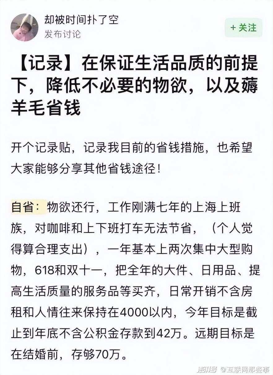 更有一名女子因为“抠门”上了热搜,她每年买衣服不超过100元,很少在日用品上花钱,交通费全靠领券,工资90%都存下来,最后大学没毕业就买下了第一套房,32岁通过攒钱,再次买下了南京的两套房。