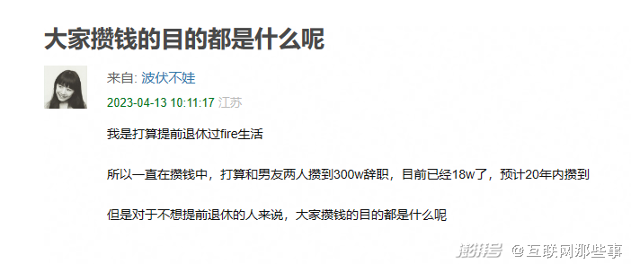 攒钱的目的是为了攒够未来的生活成本,实现早日退休。这也是不少年轻人攒钱的目的。也就是说,没有满足当下的消费与享乐的快感,但能带来延迟的满足。