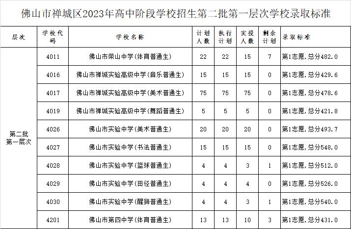 第一层次,佛山市第四中学体育特长生最低控制分数线为文化科418分。佛山市荣山中学体育特长生最低控制分数线为文化科470分。佛山市实验中学体艺类特长生根据考生志愿按合成总分成绩由高分到低分择优录取,文化科最低控制线为495分。佛山市禅城实验高级中学艺术特长生根据考生志愿按合成总分成绩由高分到低分择优录取,文化科最低控制线为494分。各学校未完成计划自动收回,转为该校面向区内招生的普通生计划。