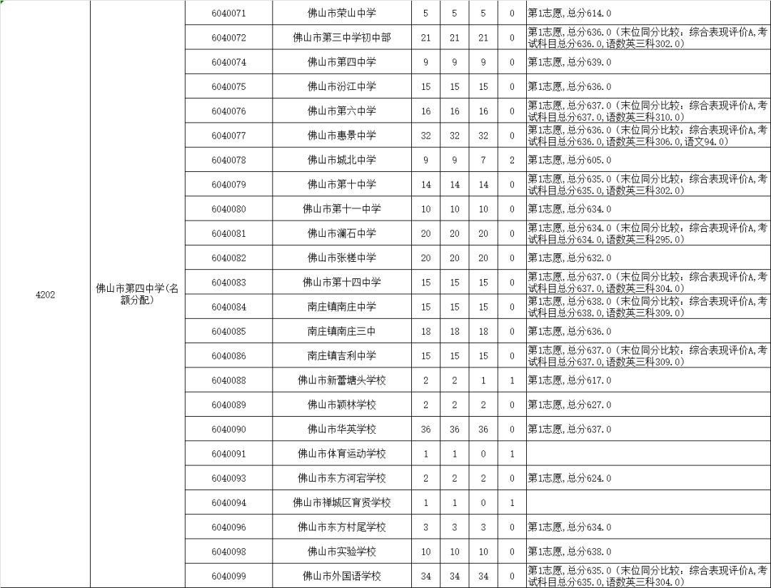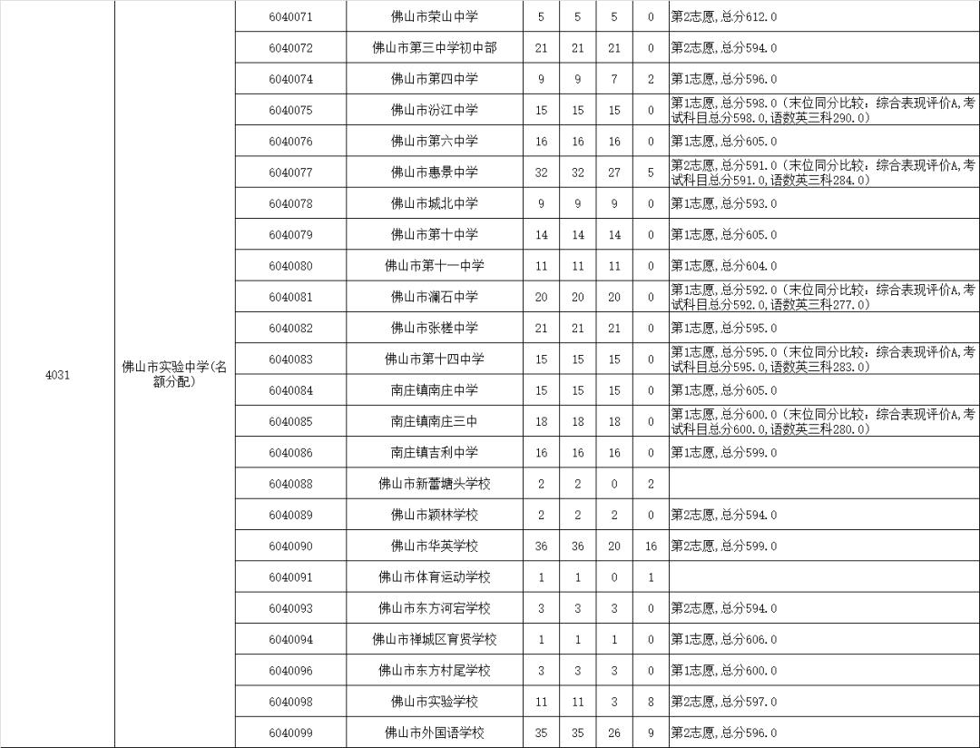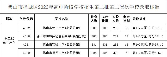 第二层次,佛山四中等4所学校名额分配不低于录取最低资格要求591分,按考生志愿的先后顺序从高分到低分录取的原则,划定各初中录取标准。未完成计划转入第三层次招生。
