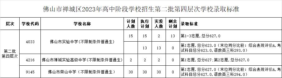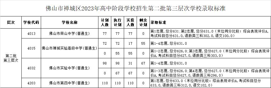 第三层次,佛山四中等4所学校普通生(含剩余招生计划)不低于录取最低资格要求591分,其录取控制分数线631分。在此分数线之上,部分学校的招生计划未完成,按考生志愿的先后顺序从高分到低分录取的原则,以5分为一个分数段依次降分投档,直到该学校招生计划完成为止。