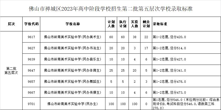 第五层次,佛山市岭南美术实验中学民办生最低录取控制分数线470分。佛山市岭南美术实验中学艺术特长生,最低控制线为420分。佛山市岭南美术实验中学体育特长生,最低控制线为300分。