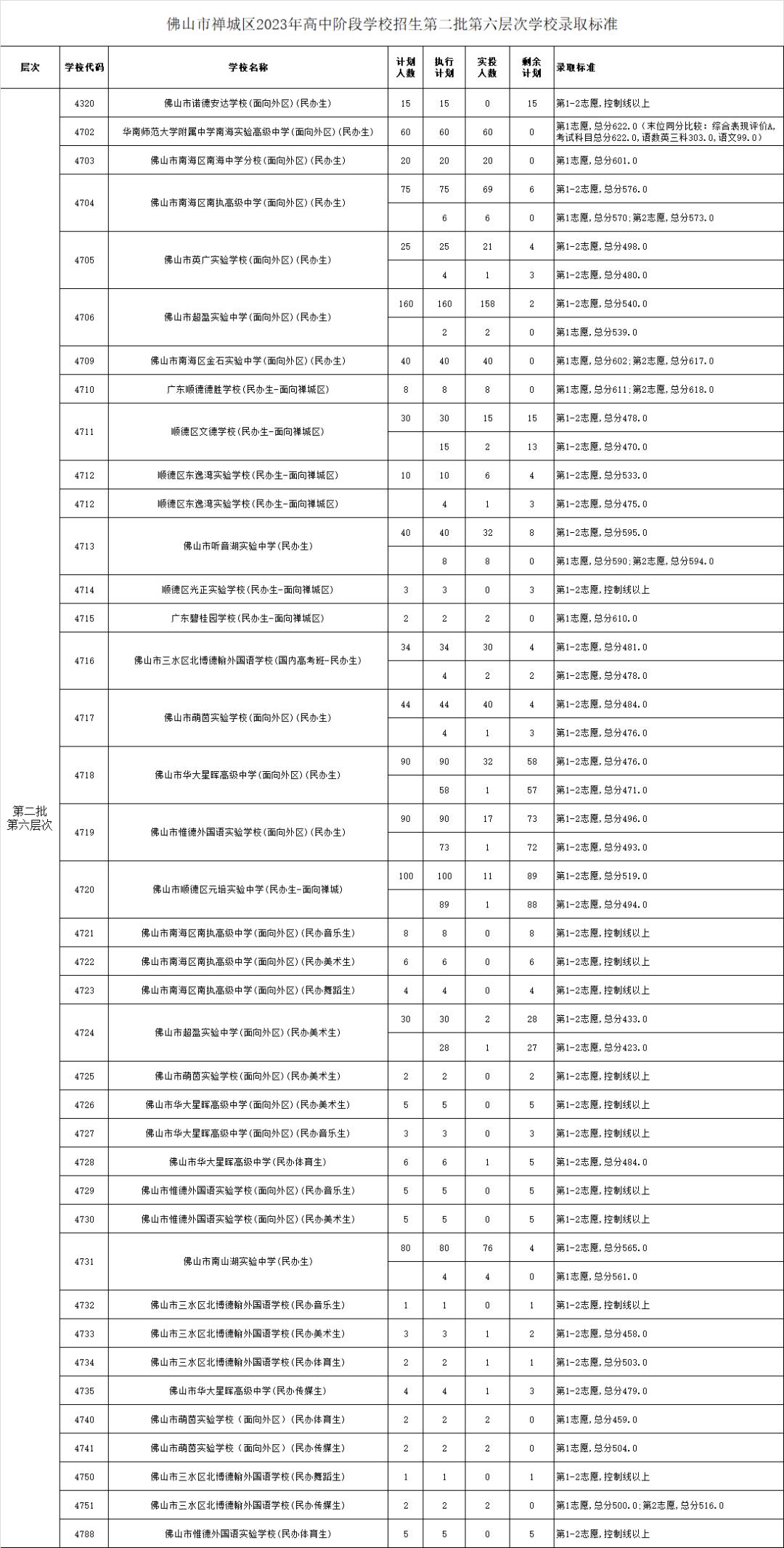 16所公办普通高中剩余招生计划面向全区招生,本层次最低录取控制分数线为591分。在此控制分数线以上未完成招生计划的学校,按考生志愿先后顺序从高分到低分录取的原则,以5分为一个分数段依次降分投档录取,直到降至顺德区普通高中普通生录取最低资格线为止(各学校具体录取标准详见附件6)。