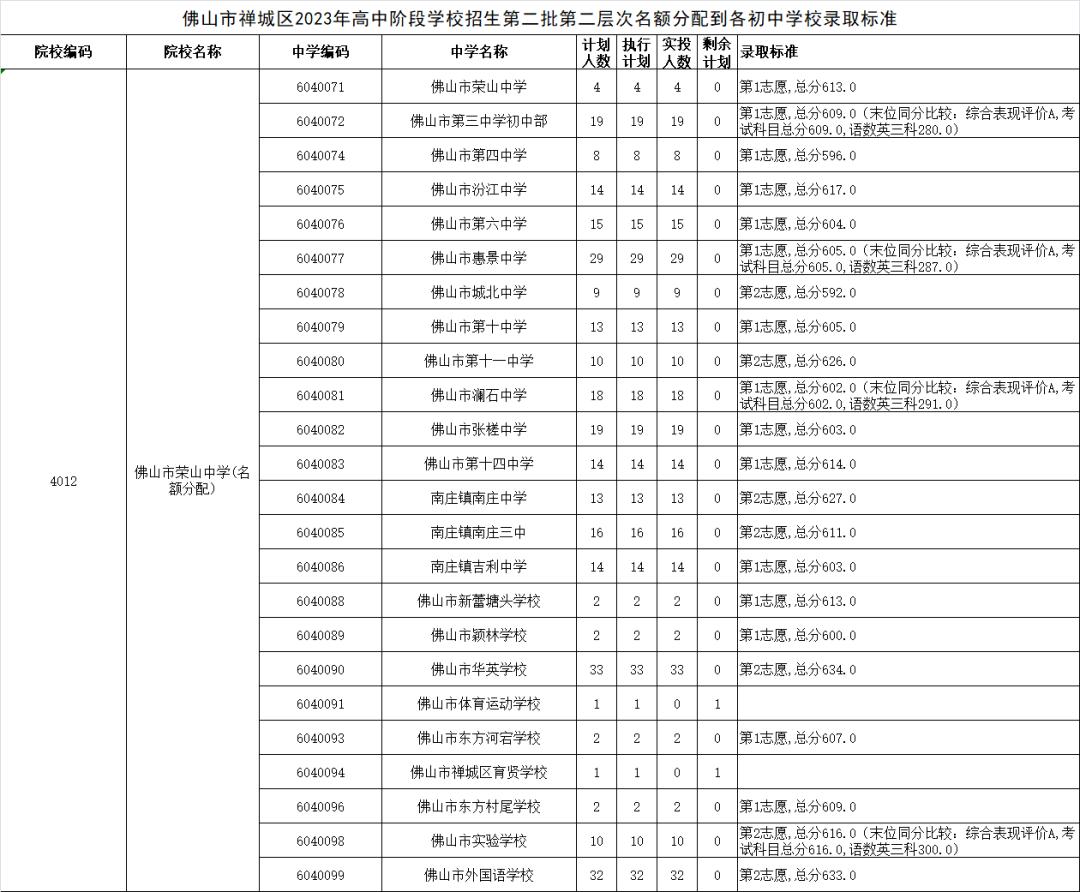 说明:各学校录取标准详见附件7《佛山市禅城区2023年高中阶段学校招生第二批第二层次指标生分配到各初中学校录取标准》(点击查看大图)