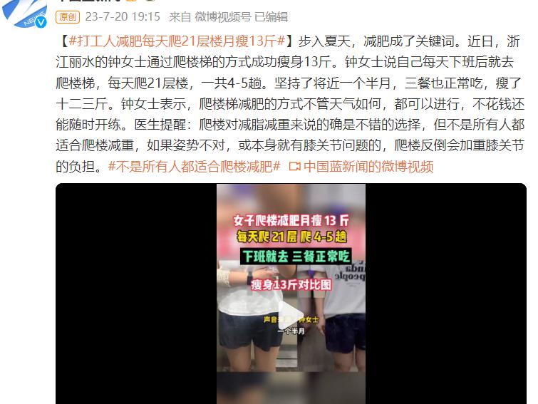 最近一段时间,前有“空腹爬楼梯,一月瘦20斤”的运动方式火出圈,被网友们盛赞为“最有效的减脂有氧运动”,今日又有#打工人减肥每天爬21层楼月瘦13斤#冲上热搜榜单,引发网友纷纷热议。