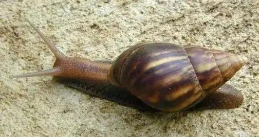 非洲大蜗牛(giant Africa snail)又名非洲巨蜗牛、露螺、褐云玛瑙螺、东风螺、菜螺、花螺、法国螺。一般寿命5-6年,最长可达9年。