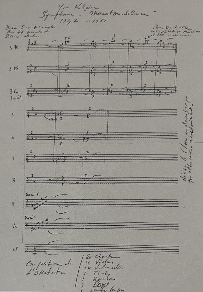 克莱因以单个震动的音符符和长时间的静默为基础创作的交响曲,这是个由有声和无声两部分组成的连续统一体,可以说是克莱因艺术生涯的序曲。《单音-静默交响曲》在1947年-1961年间反复吹演奏,它将伴随克莱因的艺术巅峰。