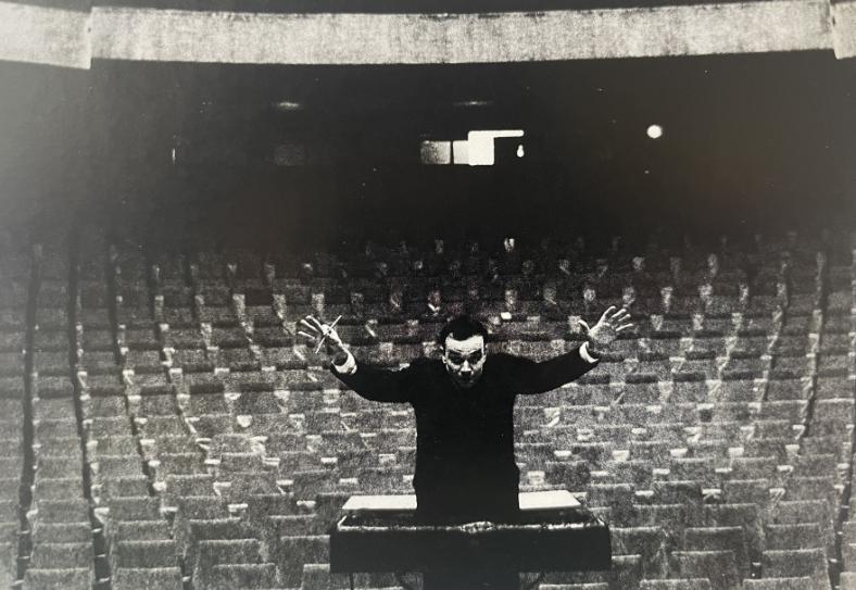 1958年《担任指挥的伊夫·克莱因》似乎无视地心引力,在无一人的观众席前盘旋。他以一种全知全能的姿态举起双臂,命令我们去注意他正在进行的美学事件。1956年,克莱因找到一种饱和的、明亮的深蓝,他称之为“蓝色最完美的表达”。这是克莱因一年实验的结果。它由克莱因独立命名。它一方面是克莱因的发明,另一方面又是他作为一个探求者对单一颜色深刻含义的探索之旅。