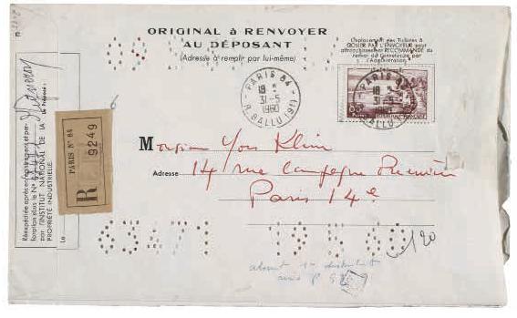 克莱因注册“国际克莱因蓝”(IKB)的第63471号索洛信封。1960 年5 月,克莱因提交了一个索洛信封,编号63471,在法国国家工业产权研究所(INPI)以“国际克莱因蓝”(IKB)的名义注册了颜料配方他为自己发明的“国际克莱因蓝”申请了专利。与普遍看法想相反,注册商标不仅仅是为了保护他对艺术中形而上的原创贡献,这是确保他所谓的“纯粹思想的真实性”在未来不被破坏的唯一途径。