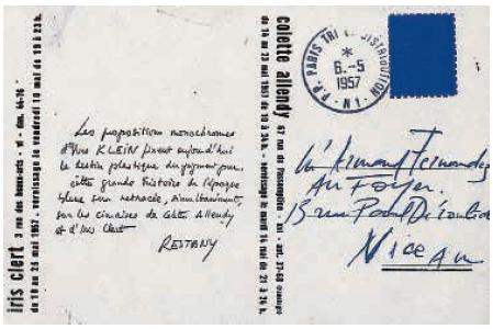 伊丽丝·克莱尔画廊和科莱特·阿朗迪画廊的克莱因双展邀请函,附有《蓝色邮票》和皮埃尔·雷斯塔尼的文字,1957 年5 月1957 年,克莱因宣布了“蓝色时代”的到来,并用一枚原创的《蓝色邮票》为他的巴黎双展发出邀请函。他的蓝色典范很快为他赢得了国际声誉,被称为“伊夫—单色画”。