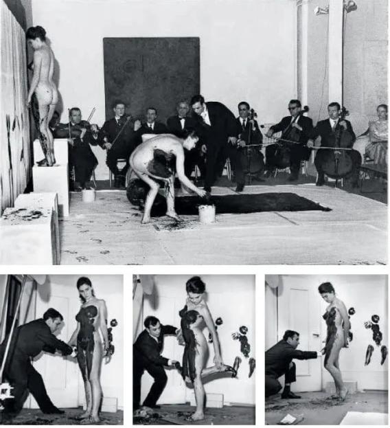1960年,他让人拍摄他从巴黎郊区一个窗台下一跃而下的照片,作为“在空中悬浮的实际演示”经过处理的照片已去去掉了柔道专家在下面拖着篷布的场景,所呈现的只是艺术家想象力的飞跃。同年,著名的《人体测量学》引起轰动,他的“活着的画笔”被涂抹了蓝色涂料,接受指令而创作出痕迹。在《宇宙起源》中,他尝试在涂了潮湿蓝颜料的画布上制造下雨的效果。为了创作他的火焰绘画,他利用真正的火焰吧图案烧入卡纸。在后来的火焰作品中,他又加入红、蓝、金色……