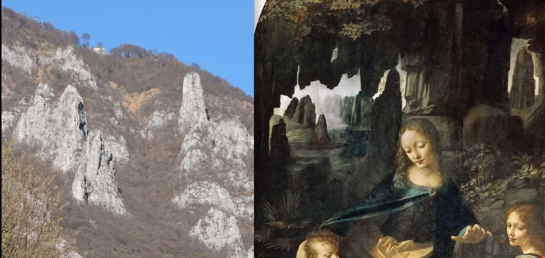 图7. 米兰附件莱科市附近风景与达·芬奇画中岩石背景对比图丨图片来源:维基百科最近的研究发现,达·芬奇《岩间圣母》中的岩石造型应该来自画家对米兰附近莱科市(Lecco)科莫湖(Lago di Como)边圣马蒂诺山(San Martino)坡上岩石的实际观察与艺术加工(见图7)。(笔者在此感谢Luca Bonatti教授莱科市地貌的介绍。)