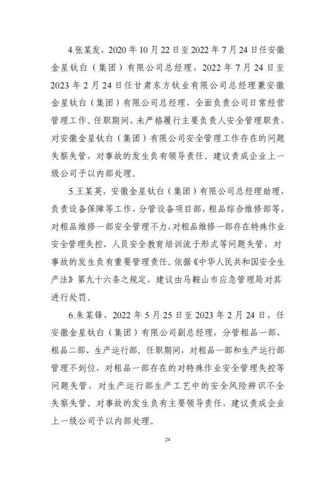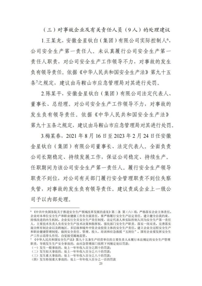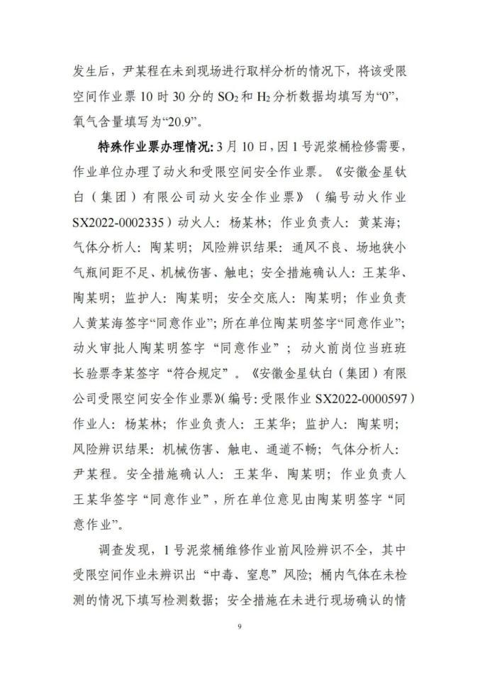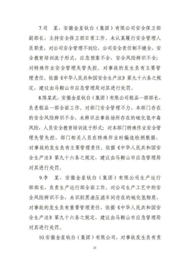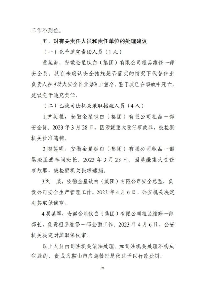 1. 黄某海其在未确认安全措施是否落实的情况下代替作业负责人在《动火安全作业票》上签名,鉴于其已在事故中死亡,建议免于追究责任;尹某程、陶某明,因涉嫌重大责任事故罪,被检察机关批准逮捕;刘某、吴某军已被司法机关采取措施;王某龙等9名事故企业相关责任人,被依法处罚;安徽金星钛白(集团)有限公司,对事故发生负有责任,建议由马鞍山市应急管理局对其进行处罚。