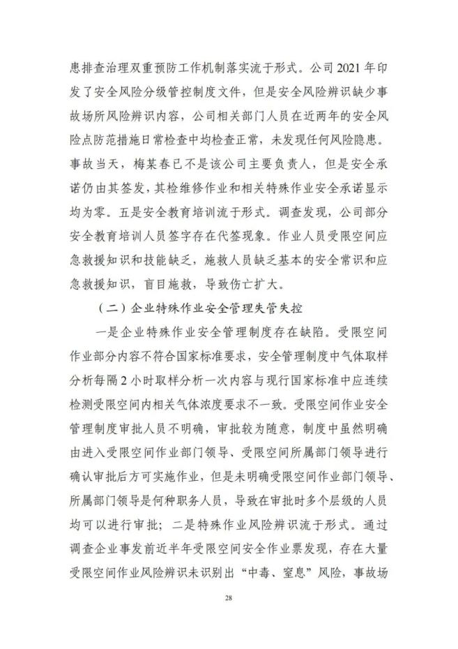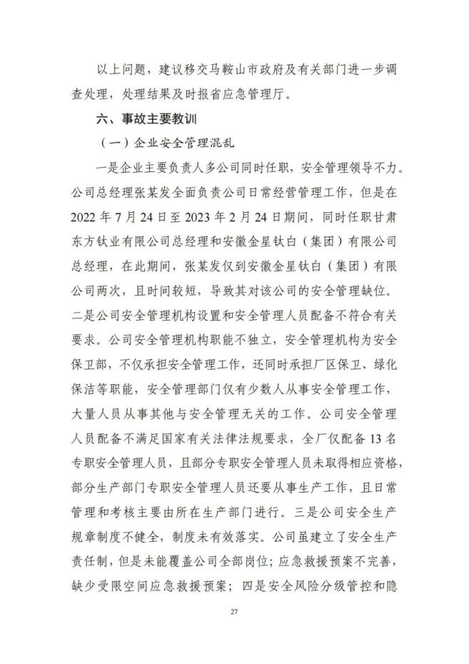 企业主要负责人多公司同时任职,安全管理领导不力。公司安全管理机构设置和安全管理人员配备不符合有关要求。公司安全生产规章制度不健全,制度未有效落实。安全风险分级管控和隐患排查治理双重预防工作机制落实流于形式。安全教育培训流于形式。