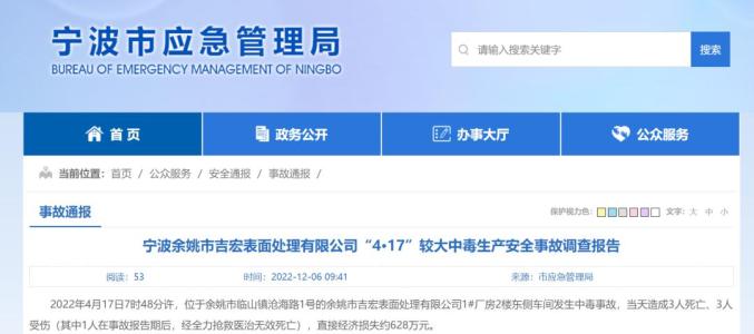 2022年4月17日,浙江省余姚市的吉宏表面处理有限公司发生中毒事故,车间员工谈某某在未确定加药槽内溶液酸碱度的情况下,将约15公斤硫化钠直接倒入,造成槽内瞬间沸腾,冒出大量灰色泡状液体,谈某某和随后盲目施救的5人因吸入高浓度硫化氢先后晕倒,其中3人因硫化氢中毒抢救无效死亡。案例六