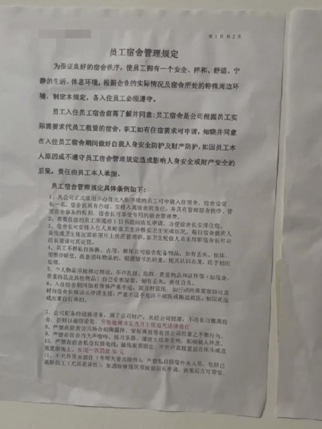 据了解,该房屋的承租人是附近一家餐饮店老板,而这间两室一厅的屋子正是为员工准备的宿舍,在房间的墙上还贴着一张“员工宿舍管理条例”。