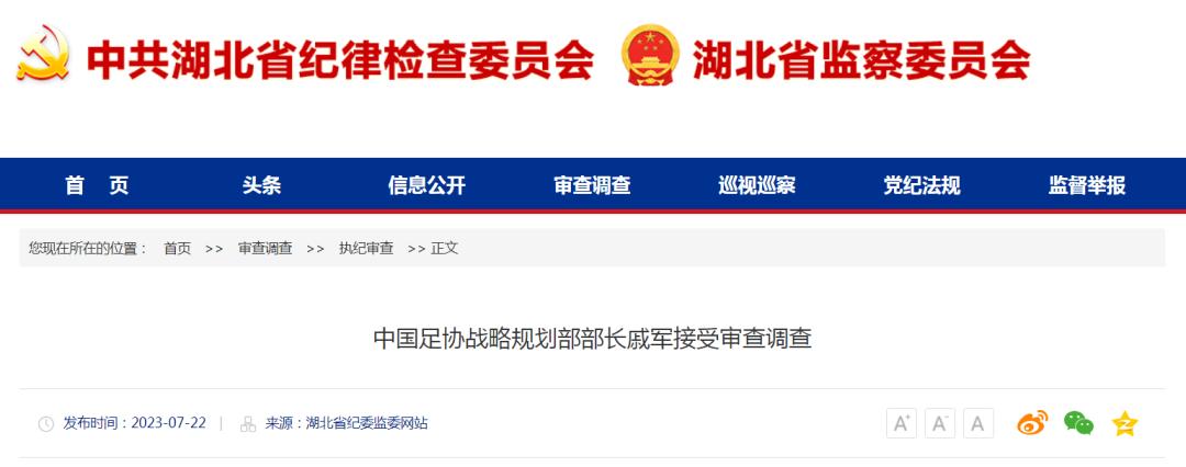 中国足球协会战略规划部部长戚军涉嫌严重违纪违法,目前正接受中央纪委国家监委驻国家体育总局纪检监察组和湖北省监委审查调查。