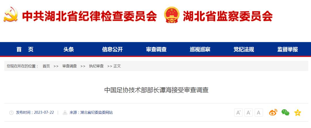 中国足协技术部部长谭海接受审查调查中国足球协会技术部部长谭海涉嫌严重违纪违法,目前正接受中央纪委国家监委驻国家体育总局纪检监察组和湖北省监委审查调查。