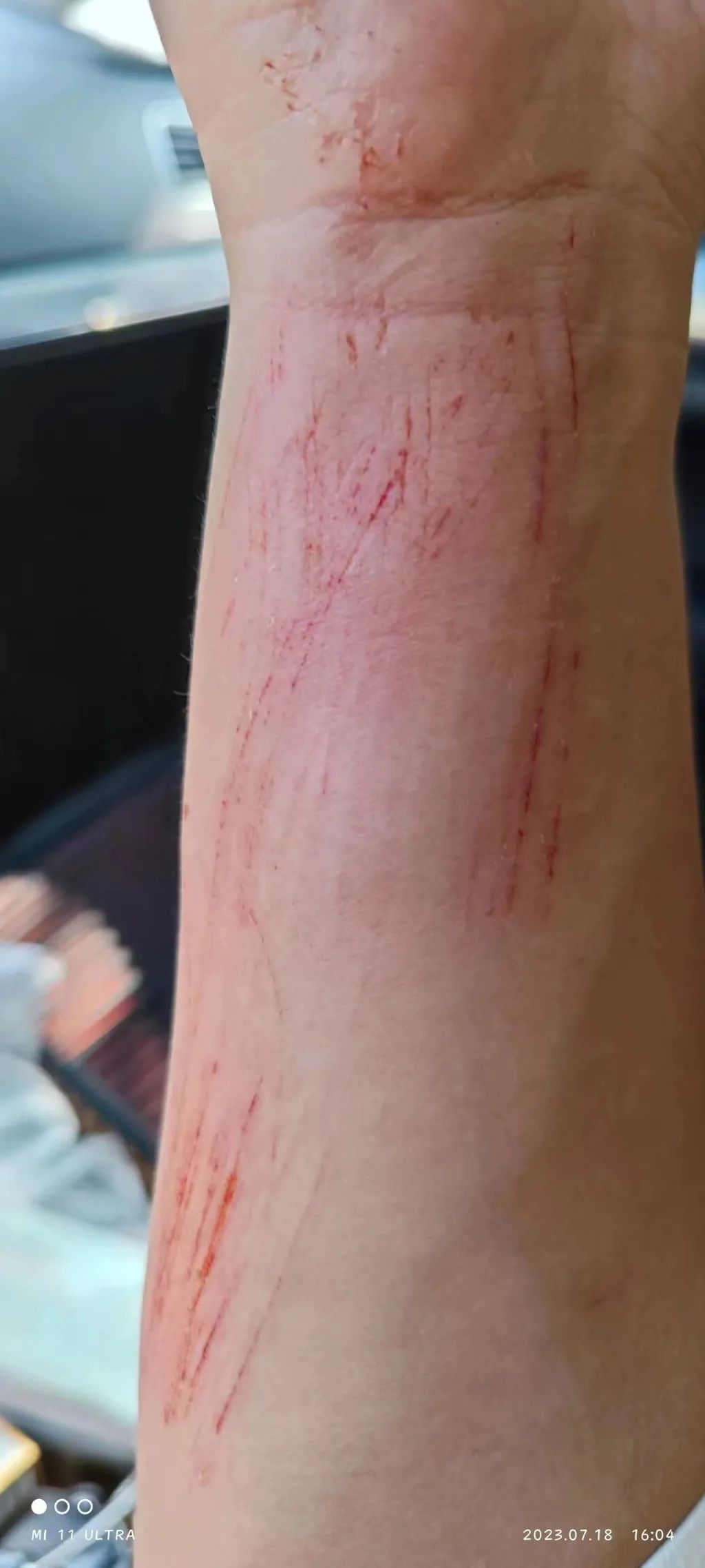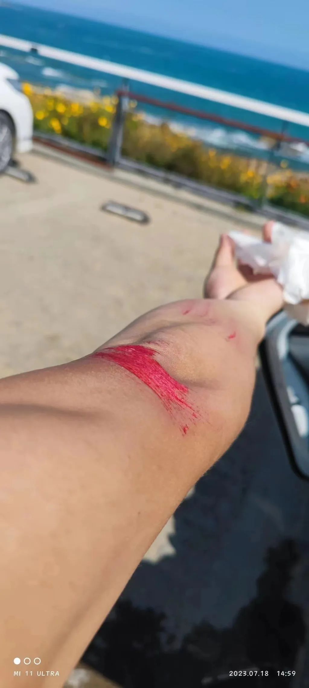 记者采访得知,刘先生的孩子年龄都很小,一个4岁,一个8岁,被大浪打入水中后,两个孩子吓得哇哇大哭。“我落到水里后,正好卡在两块礁石之间,我用身子挡着大浪,拉着老婆和两个孩子,别让他们被冲走了。我身子另一边就是大海,不知道多深,而且海浪非常大。”刘先生介绍,在大浪的冲击拍打下,一家四口不停地撞击到礁石上,身体都被划伤,“我受伤最严重,胳膊和后背都刮破了。”