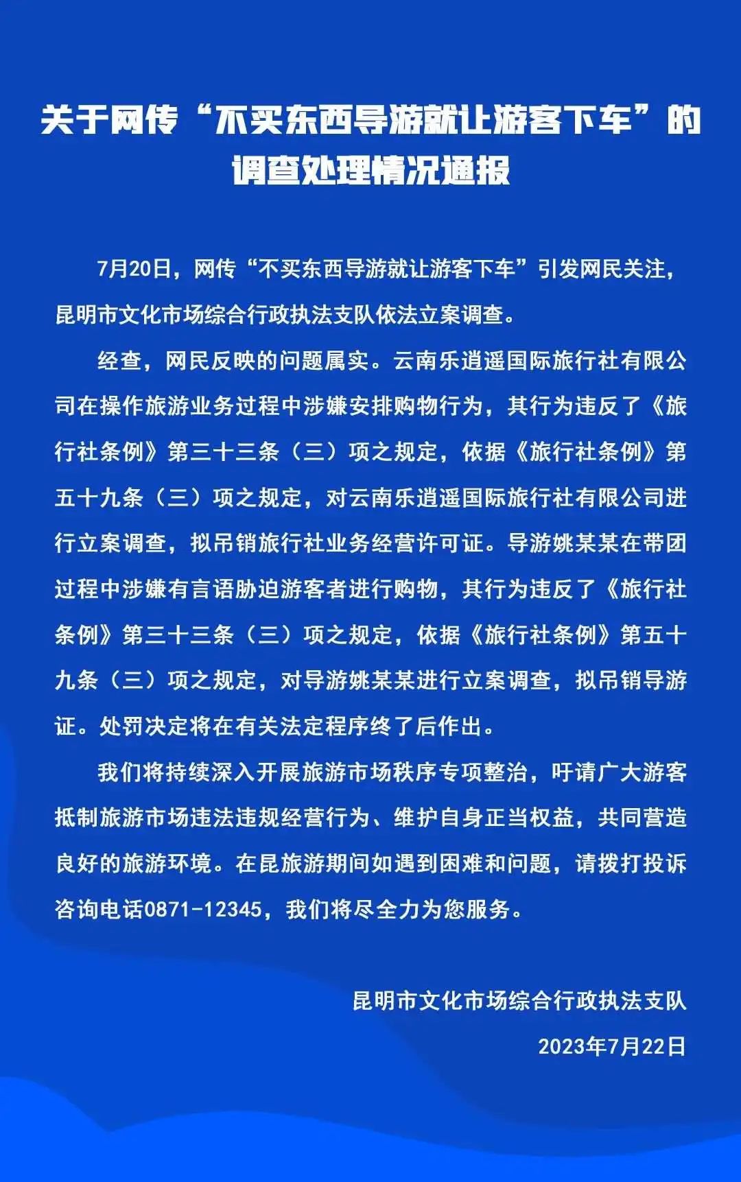 7月22日,昆明文旅微信公众号发布关于网传“不买东西导游就让游客下车”的调查处理情况通报,如下: