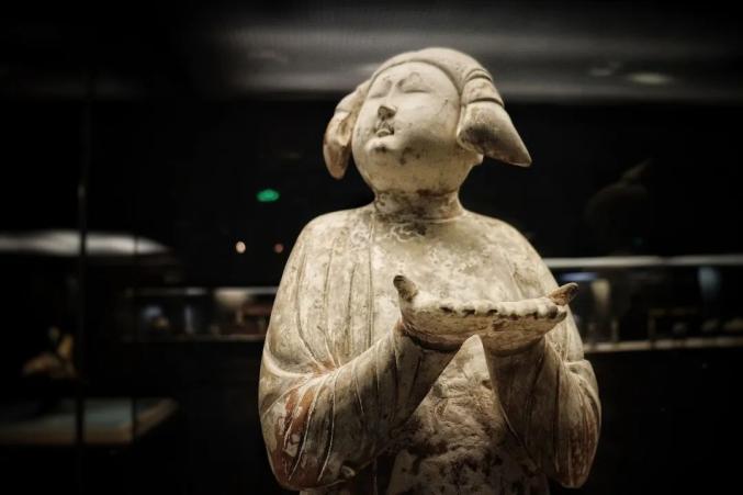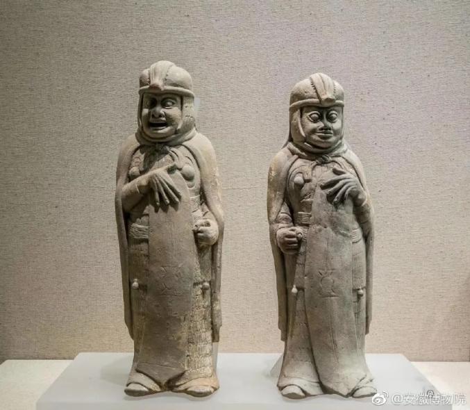 这两件守门武士俑一为张口鼓目,面带笑容,一为竖眉鼓眼,脸为怒容。一手按盾,一手执兵器(所执兵器已脱落)。用陶俑陪葬在秦至唐代贵族墓葬中较流行,主要根据各时期官吏的形象雕塑而成,以显示死者生前显赫的地位。安徽博物院现藏文物31万余件,特色藏品包括商周青铜器、汉代画像石、文房四宝、徽州雕刻等,中国最早的“冰箱”吴王光鉴也收藏在这里。