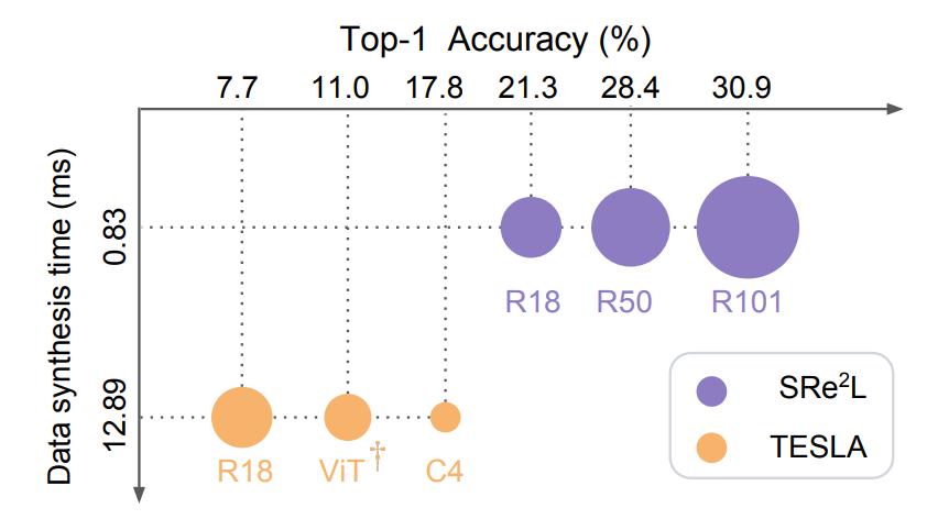 可以看到,在相同 IPC 情况下,本文实验结果远超之前方法 TESLA。同时,对于该方法蒸馏得到的数据集,当模型结构越大,训练得到的精度越高,体现了很好的一致性和扩展能力。下图是性能对比的可视化结果,可以看到:对于之前方法 TESLA 蒸馏得到的数据集,当模型越大,性能反而越低,这对于大规模数据集蒸馏是一个不好的情况。与之相反,本文提出的方法,模型越大,精度越高,更符合常理和实际应用需求。