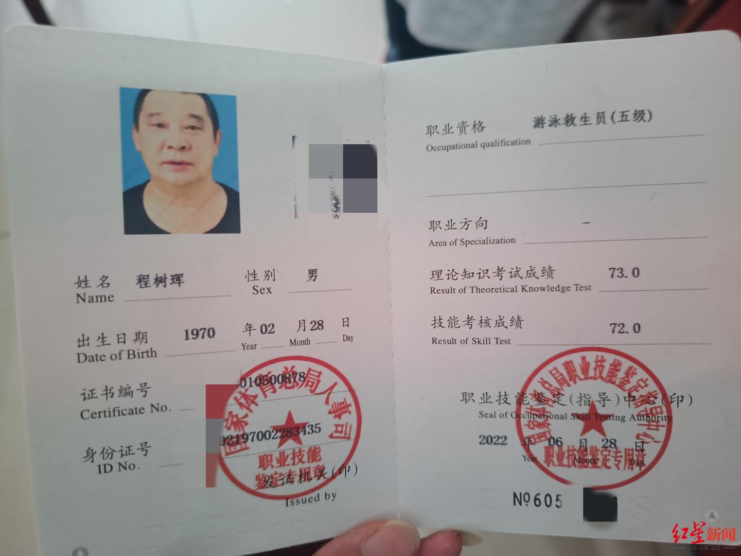 在程树珲家里,墙上张贴有多张参加游泳比赛、无偿献血的荣誉证书,还有一本游泳救生员(五级)证书。李容告诉记者,丈夫的水性比较好,“想到他之前多次下水救过人,我就没有多想,让他去了。”