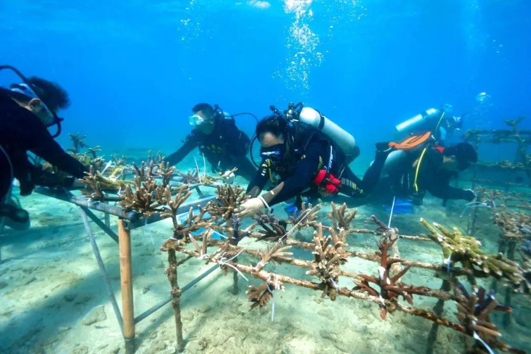 珊瑚礁生态系统也被称为水下“热带雨林”,具有保护海岸、维护生物多样性、维持渔业资源、吸引旅游观光等重要功能。但在分界洲岛开发之前,海底珊瑚因不法分子盗采损毁严重。为了有效恢复分界洲岛周边海域海底生态,海南分界洲岛旅游区自2004年起就联合海南省海洋与渔业科学院开展珊瑚保育工作。涂明艳说,“经过努力,分界洲岛旅游区海域珊瑚覆盖率达10%至30%,局部浅水区域珊瑚覆盖率达30%至50%,良好的海洋环境使周边的珊瑚生态逐渐恢复,海洋生物也逐渐增多”。