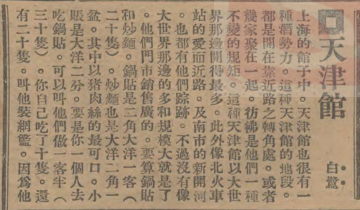 上海的馆子中,天津馆也很有一种潜势力。这种天津馆的地段,都是开在靠近路之转角处,或者几家聚在一起,仿佛是他们的一种不变的规矩。这种天津馆以大世界那边开得最多。此外像北火车站的爱而近路,及南市的新开河,也都有他们的踪迹,不过没有像大世界那边的多和规模大就是了。他们门市销售广的,要算锅贴和炒面。锅贴是二角大洋一客(二十只),炒面也是大洋二角一盆。其中以猪肉丝的最可口。小账是大洋二分,要是你一个人去吃锅贴,可以叫他们做一客半(三十只),你自己吃了十只,还有二十只,叫他装网篮,因为他们锅贴很大,你一个吃了十只,尽饱尽饱。不过如果家里人少的那末只叫一客就够了。十只你吃了,十只叫他们装网篮,不过须多花一分大洋钱(二十只装网篮,不取网篮钱的)。到那边去吃,有一种好处,就是奉送一壶茶给你解渴,这种设施,实在是他种馆子不及的。他们除了上二种食品之外,再有一种便饭,上面覆些过桥(即热炒小菜),每碗只须一角大洋。有几家大些的,还有汤面和肉馄饨,价钱都比他种馆子贱,阅者不妨前去一试。(白鹭《天津馆》,《上海常识》1928年第38期)