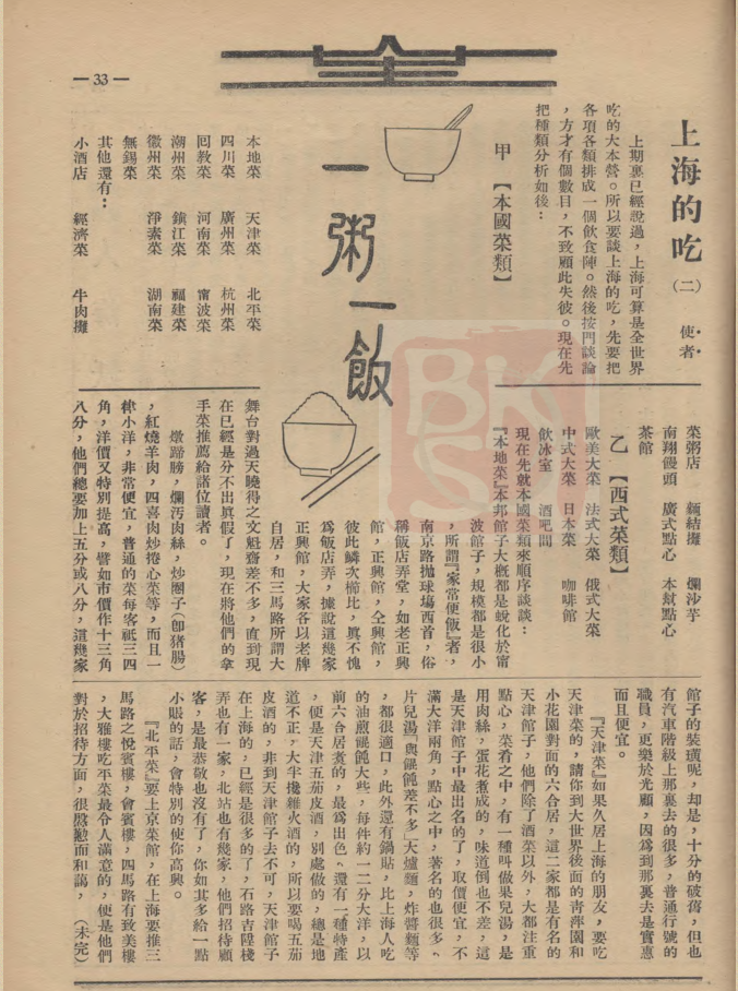 使者《上海的吃》, 《人生旬刊》 1935年 第1卷 第4期