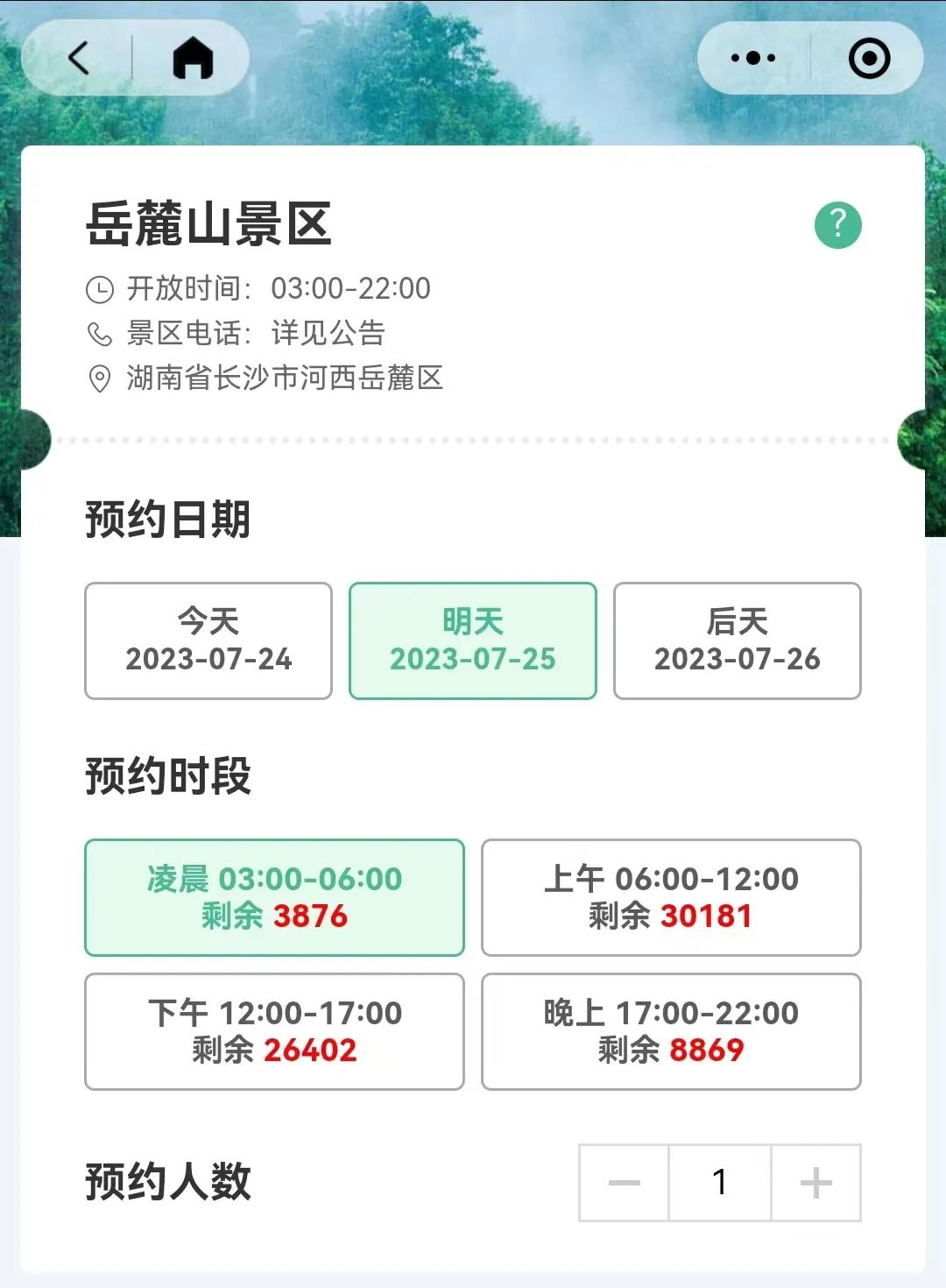 共有4个预约时段,分别为凌晨03:00-06:00,上午06:00-12:00,下午12:00-17:00,晚上17:00-22:00。想去岳麓山看日出的朋友,可以预约凌晨3点到早上6点这个时间段。