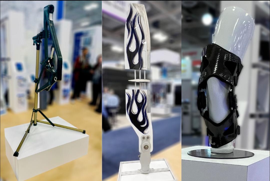 山地自行车(左)、主旋翼桨叶(中)和护膝(右)应用示例。东丽集团(日本东京)将重点展示使用其复合材料套件的全尺寸零件应用。东丽的专业产品组合包括东丽碳纤维以及先进的热塑性和热固性复合材料。