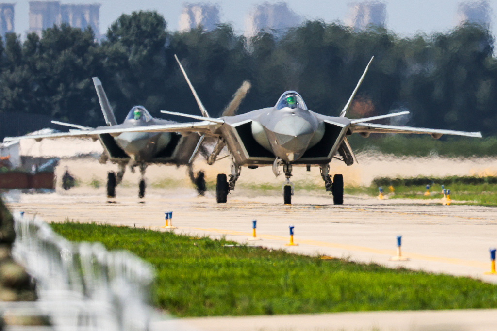 2023年7月24日,2023年空军航空开放活动·长春航空展预演,国产第五代隐形战机歼-20双机降落空军长春机场,观众近距离感受歼-20雄姿。