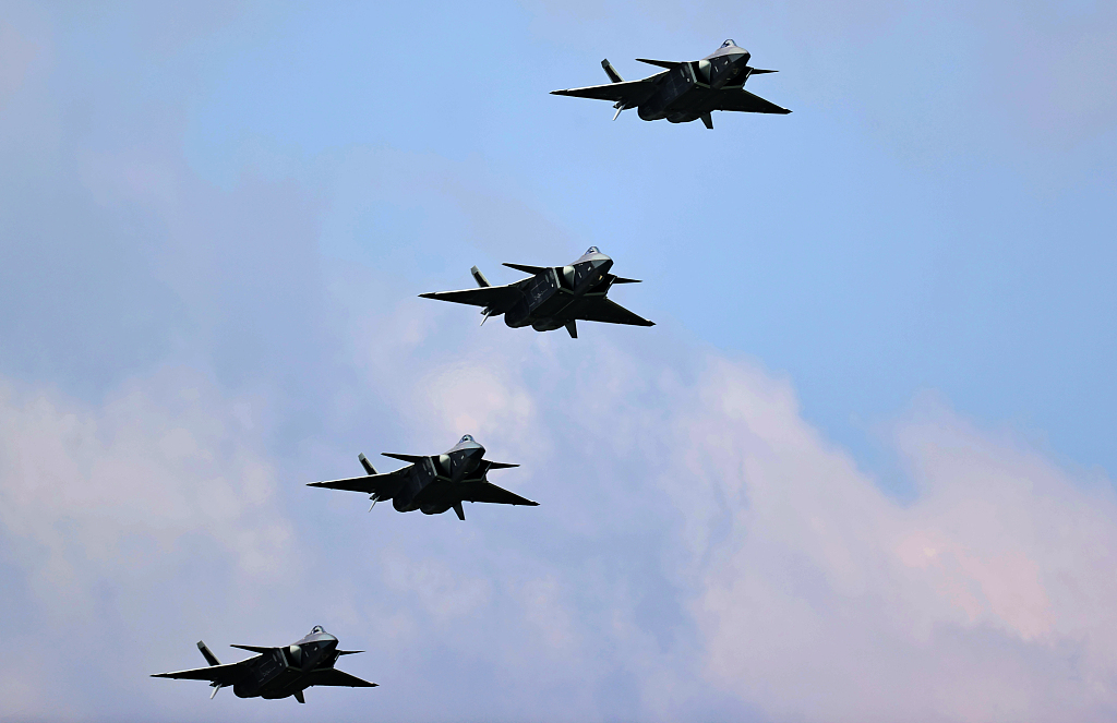 2023年7月24日,2023年空军航空开放活动·长春航空展预演,国产第五代隐形战机歼-20四机亮相空军长春机场。