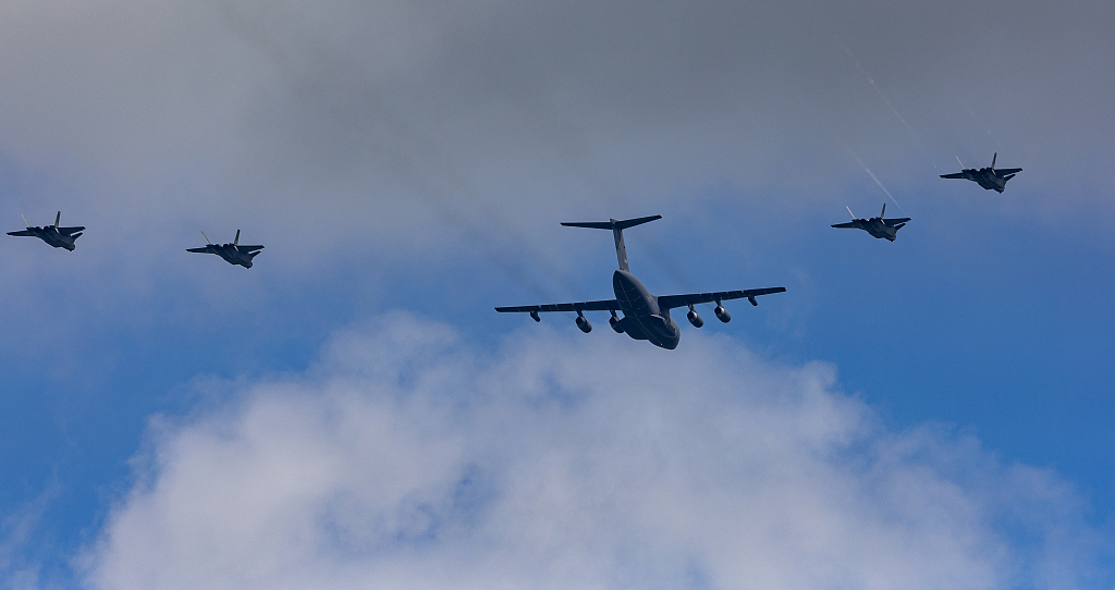 2023年7月24日,2023年空军航空开放活动·长春航空展预演,歼-20四机编队伴飞运-20。