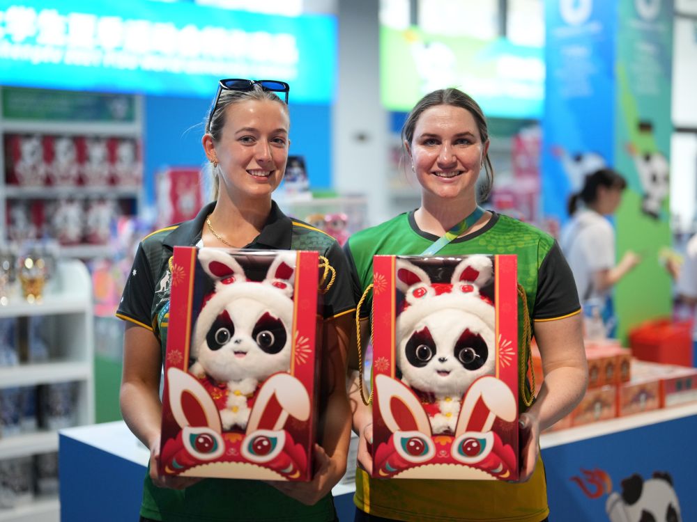 澳大利亚水球队的露辛达·苏珊和队友逛了将近二十分钟,最终选择了戴着兔耳朵帽子的兔年版“蓉宝”,因为“觉得这个造型最可爱”,而当大家给她解释这个造型的来源时她才恍然大悟:“原来今年是中国的兔年?那我就知道为什么是这个造型了!”