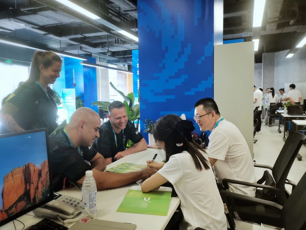国外大学生代表团成员在成都大运村咨询城市文化体验观光线路活动。受访者供图