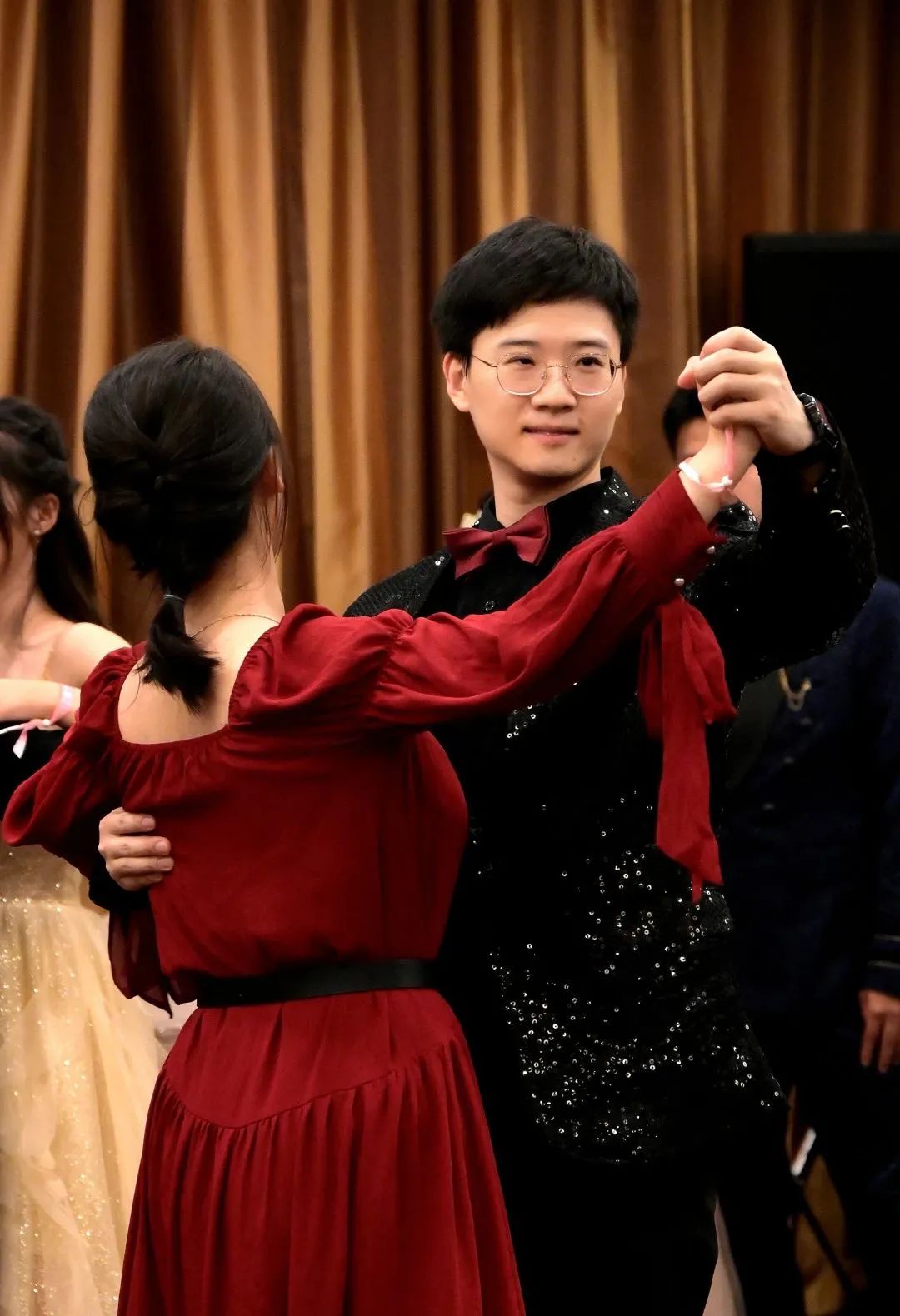舞会上,曼曼舞姿与翩跹裙摆交相辉映。同学们自由邀请舞伴,尝试编舞。“交谊舞的特点是简单易学,门槛比较低,因此具有强大的社交属性。”舞协负责人、2020级本科生张舒蔚介绍,“来参加的同学有些阳光外向,也有些略微腼腆,但他们每个人都勇敢地迈出了一步,在其中一定会收获许多好友和不一样的自己。”
