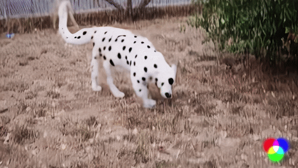 然后向 Gen-1 输入文字指令「白毛上有黑点的狗。」我们就可以得到编辑后的视频。
