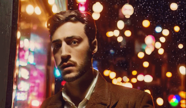 输入一张照片 + 文字「低角度镜头:一个男人走在街上,被他周围酒吧的霓虹灯照亮。」