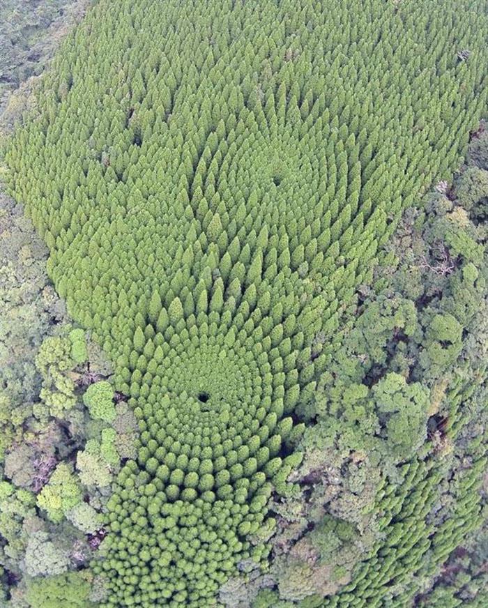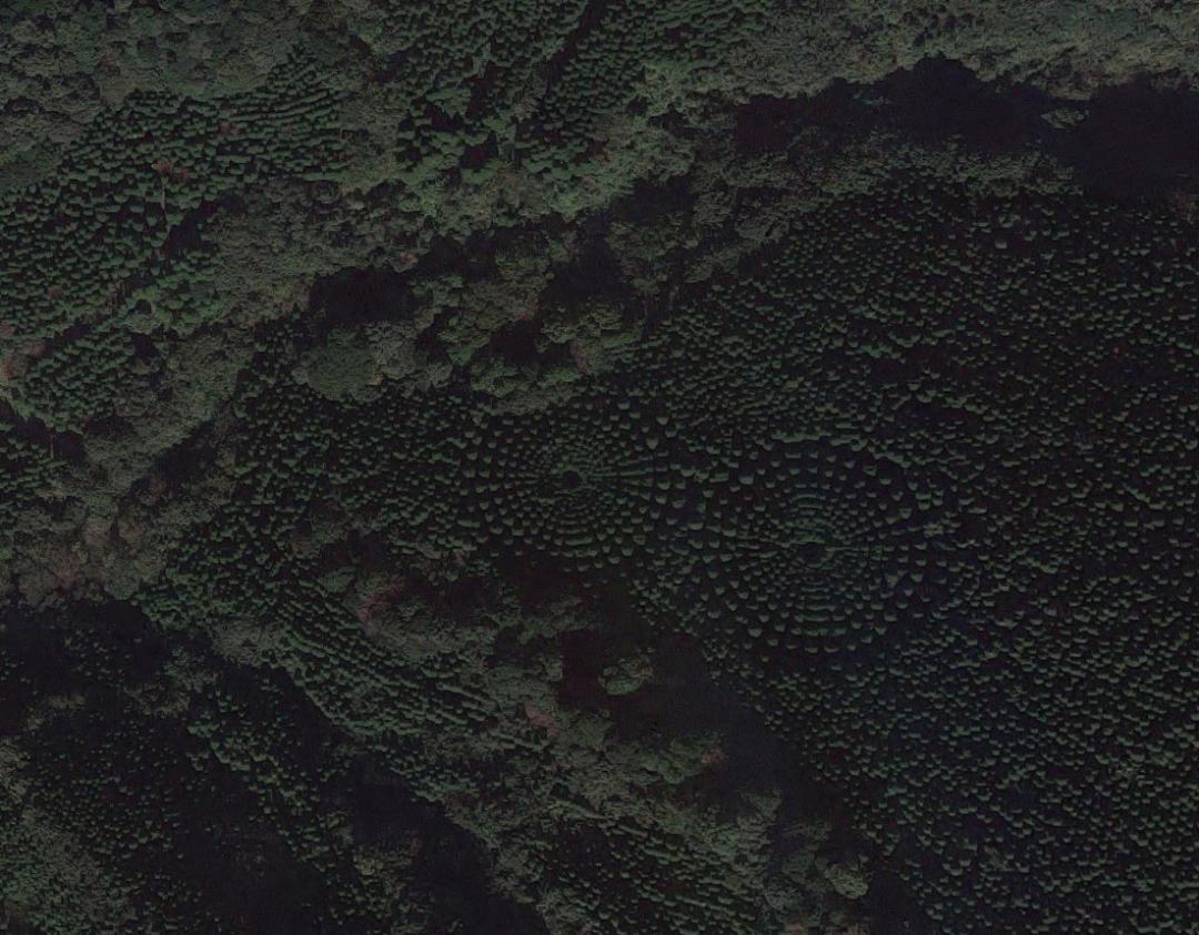 2018年,有人在Google地图上发现了两个神秘的树木怪圈,位于日本宫崎县,这里种植着一大片日本柳杉(Cryptomeria japonica)。