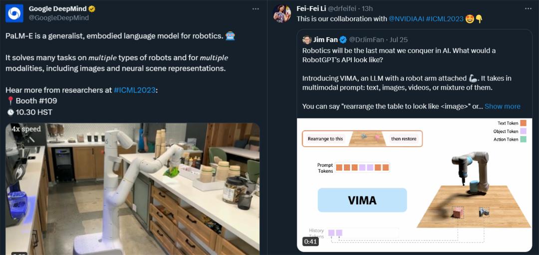 在这次大会上,谷歌打造的 PaLM-E 和斯坦福大学李飞飞教授、英伟达高级研究科学家 Linxi "Jim" Fan(范麟熙,师从李飞飞)参与打造的 VIMA 机器人智能体悉数亮相,展示了具身智能领域的顶尖研究成果。