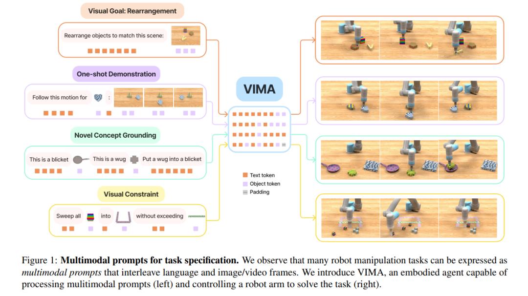 VIMA 是一个带有机械臂的 LLM ,它接受多模态 Prompt :文本、图像、视频或它们的混合。