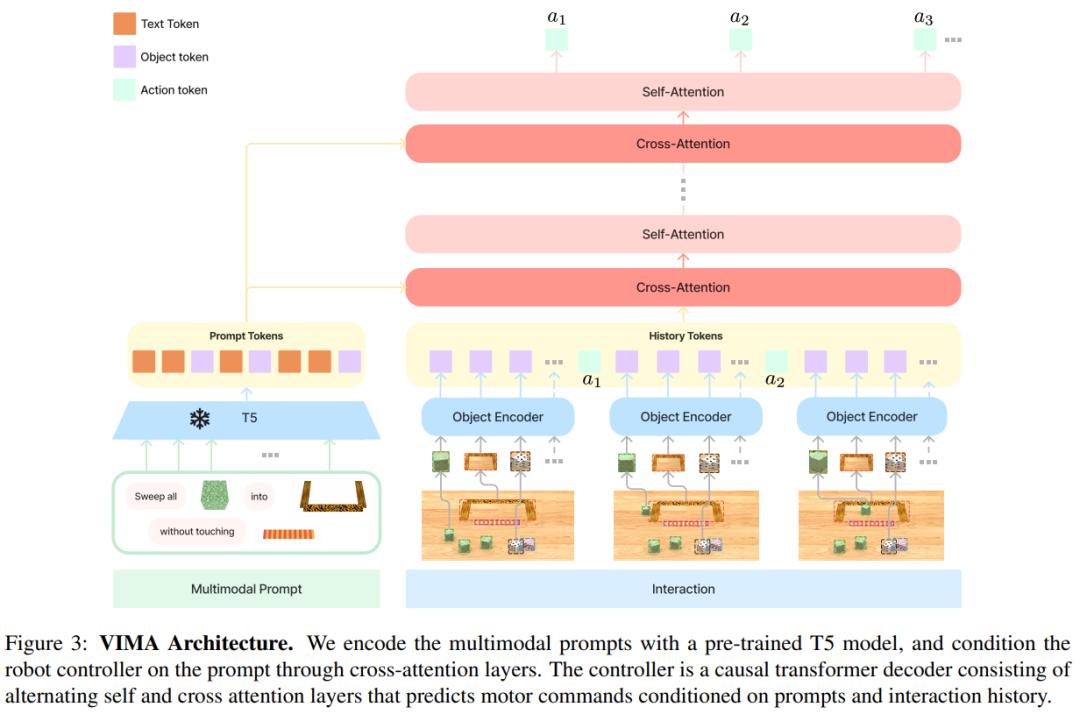 本文旨在构建一个机器人智能体,该智能体可以执行多模态 prompt 任务。本文提出的 VIMA 兼具多任务编码器 - 解码器架构以及以对象为中心的设计。VIMA 的架构图如下: