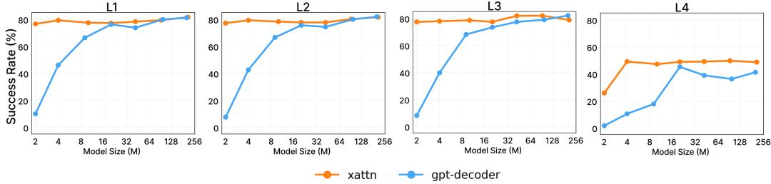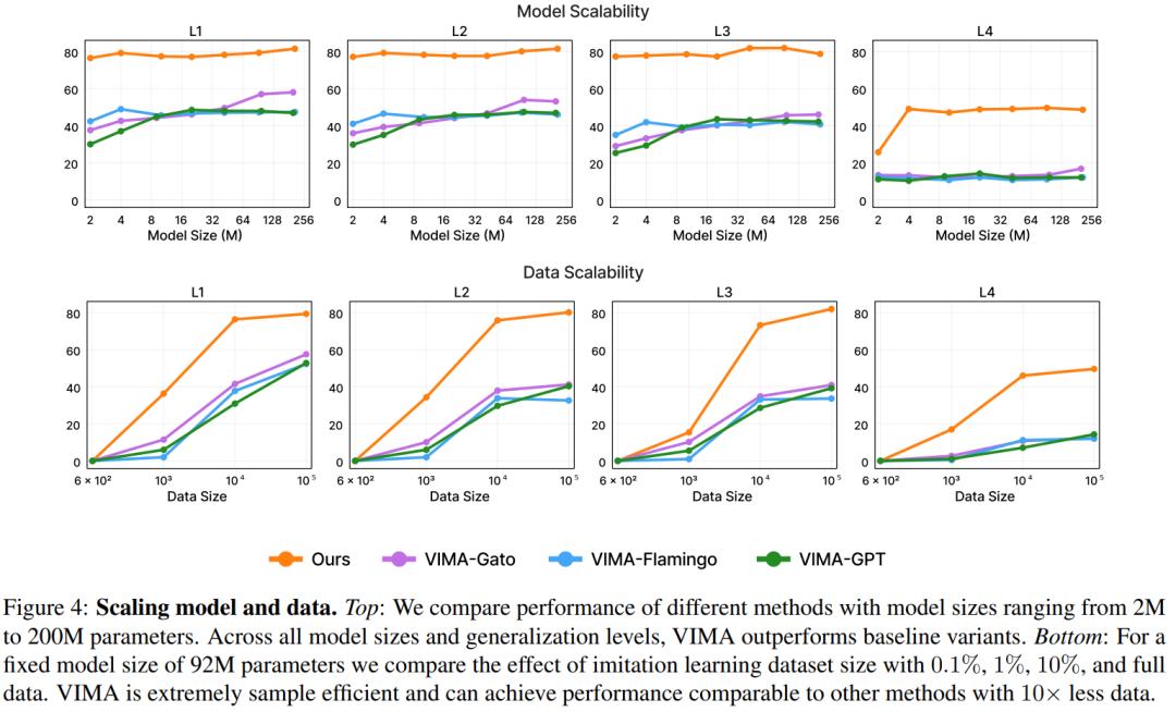 下图(上部)比较了不同模型大小(参数范围从 2M 到 200M)的性能,结果表明,VIMA 在性能上明显优于其他方法。尽管像 VIMA-Gato 和 VIMA-Flamingo 这样的模型在较大的模型大小下表现有所提升,但 VIMA 在所有模型大小上始终表现出优异的性能。
