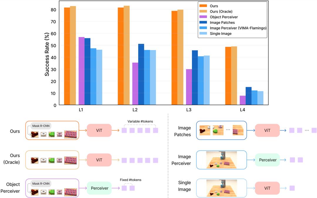 对视觉 tokenizer 的消融研究:下图比较了 VIMA-200M 模型在不同视觉 tokenizer 上的性能。结果表明,本文提出的对象 token 优于所有直接从原始像素学习的方法,此外,这种方法还优于 Object Perceiver 方法。