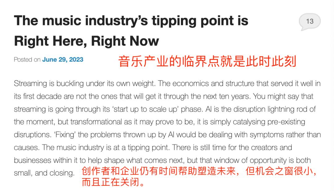 如果说,五年前,AI音乐还是天方夜谭,如今,AI正以惊人的速度覆盖音乐市场。也难怪,在观察了音乐产业十几年之后,马克·穆里甘(Mark Mulligan)近日在自己的音乐产业博客中发出了一句感慨,音乐产业到了临界点。