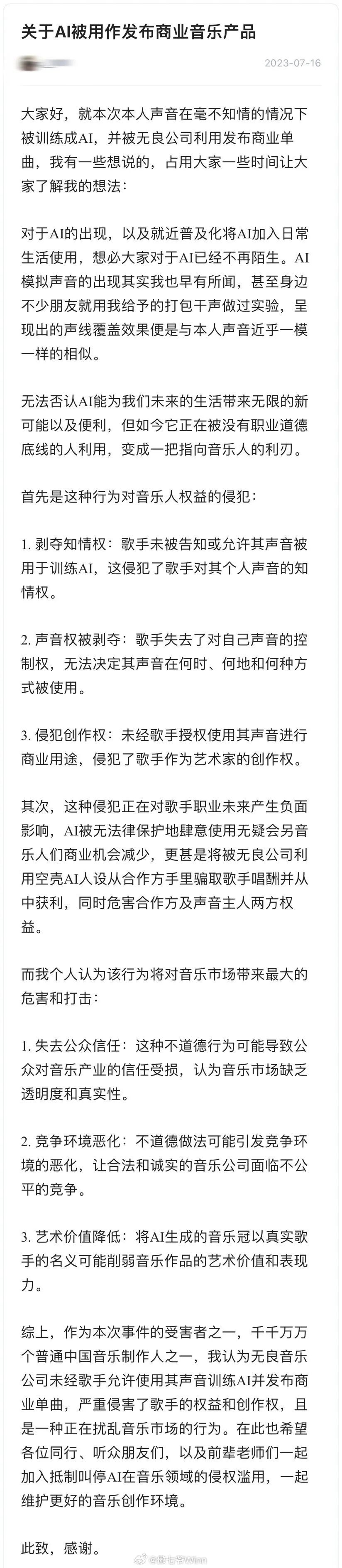 为此,傲七爷在网上发声:“无法否认AI能为我们未来的生活带来无限的新可能以及便利,但如今它正在被没有职业道德底线的人利用,变成一把指向音乐人的利刃。”